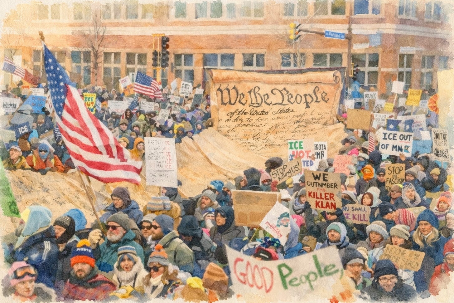 Here in the Twin Cities we had an average snowfall during rush hour last night. It didn’t stop us from getting out to protest. There were numerous reports of “brand new larger vehicles with blackened windows and no front license plates” ended up in the ditch when they tried to speed up to pass people on the roads. Seems ICE doesn’t know how to drive in the snow, especially when a good freezing rain hit the ground before the snow came.