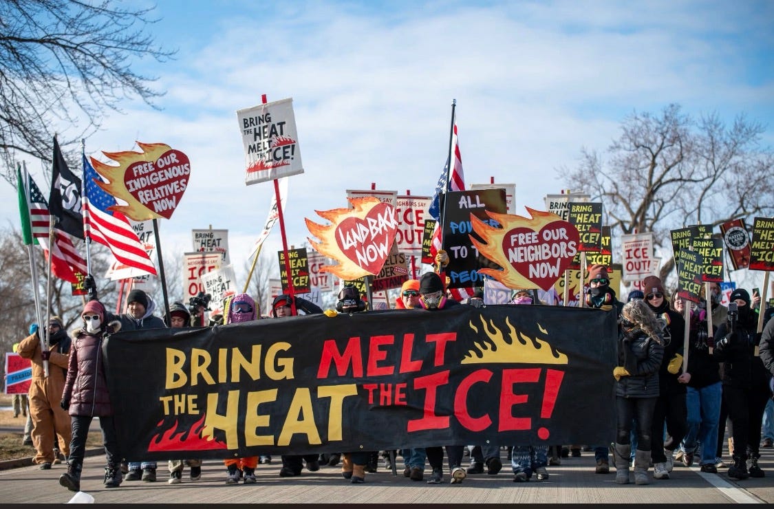 Yesterday, as part of the Bring the Heat - Melt the Ice actions happening all week, a group of protestors tried to form a human shield blocking traffic out of the north parking lot at Whipple. This was an act of civil disobedience not unlike the lunch counter sit-in of the 1960s. Simultaneously, on the south side of Whipple, Indigenous Roots performed native dancing and drumming. The Hennepin County Sheriff’s Department declared an unlawful assembly and arrested protestors on both sides. This was an example where protestors pushed beyond the boundaries of peaceful protest by blocking roadways, dumping glass into the street, and throwing rocks and ice chunks. Minneapolis City Council Member Jason Chavez was amongst those present and told the crowd: “As long as ICE remains in Minnesota…our community will occupy this space.”
